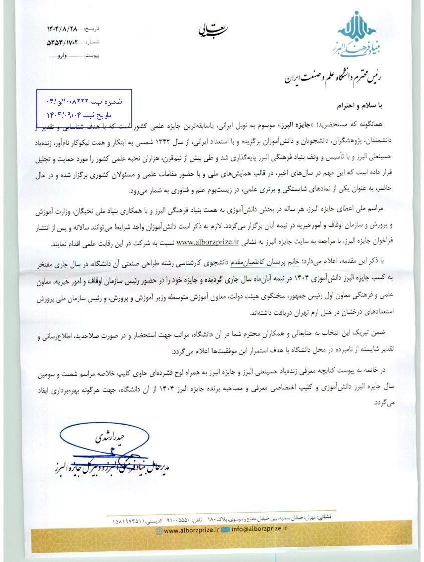 خانم پریسا کاظمیان مقدم، دانشجوی کارشناسی طراحی صنعتی، برنده جایزه بنیاد فرهنگی البرز شدند.